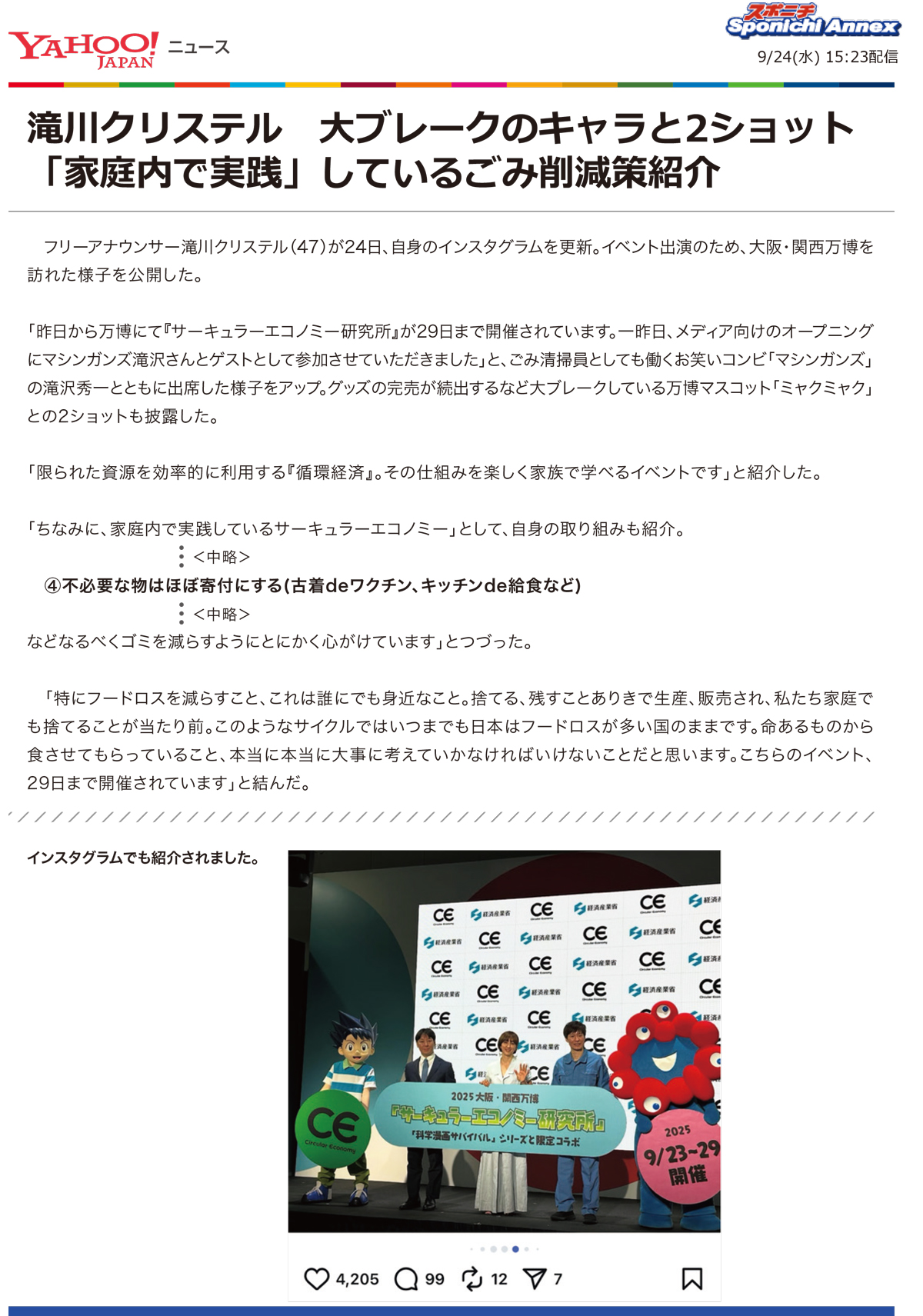 【ヤフーニュース】にて滝川クリステルさんご利用の「古着deワクチン」について紹介されました。