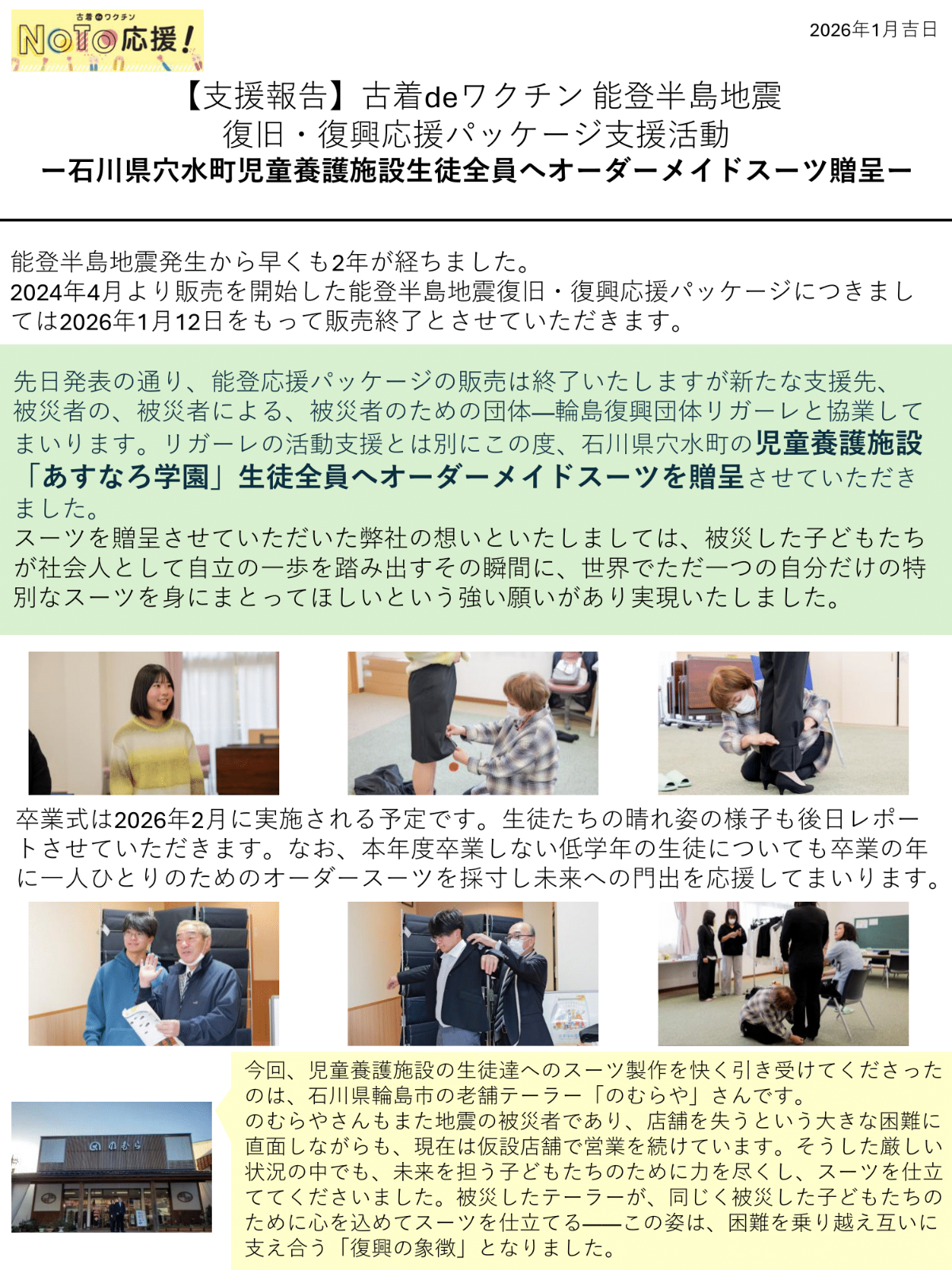 - 【能登支援】穴水町養護施設全生徒へオーダーメイドスーツ贈呈